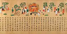 Le contenu illustre donc le sūtra des causes et des effets dans le passé et le présent (過去現在因果経, Kako genzai inga kyō), écrit au IIIe siècle en Inde et traduit en chinois au Ve[1]. Il raconte principalement la vie du Bouddha historique (Siddhārtha Gautama) et la façon dont il atteignit l’illumination ; les peintures permettent surtout d’expliciter les textes religieux auprès du peuple[1]. Plusieurs anecdotes de la vie de Siddhārtha, issu d’une famille princière en Inde, y sont présentées, comme ses activités de jeune prince, sa découverte de la misère du monde extérieur, ou sa fuite du palais pour expérimenter la méditation solitaire[6]. À la fin, il résiste à la tentation de Māra, le roi du Mal, et atteint l’illumination par la méditation.