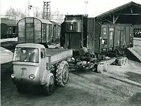 - agricole comprenant une base de tracteur agricole avec 2 ou 4 roues motrices, et une benne à l'arrière, des pneumatiques spéciaux adaptés pouvant aussi rouler sur route,