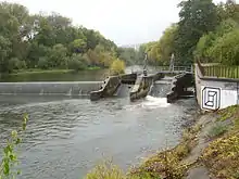 Les deux barrages de navigation d'Iéna, aussi bien celui de Rasenmühlen[27] que celui de Paradies[28] sont équipés depuis 1999-2000 de turbines pour récupérer une partie de l'énergie de la chute. Ces turbines ont repris l'emplacement d'écluses pour le halage.