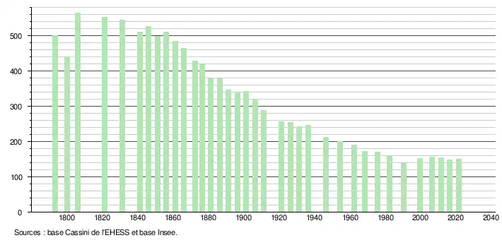 L'évolution du nombre d'habitants est connue à travers les recensements de la population effectués dans la commune depuis 1793. Pour les communes de moins de 10 000 habitants, une enquête de recensement portant sur toute la population est réalisée tous les cinq ans, les populations légales des années intermédiaires étant quant à elles estimées par interpolation ou extrapolation[26]. Pour la commune, le premier recensement exhaustif entrant dans le cadre du nouveau dispositif a été réalisé en 2006[27].