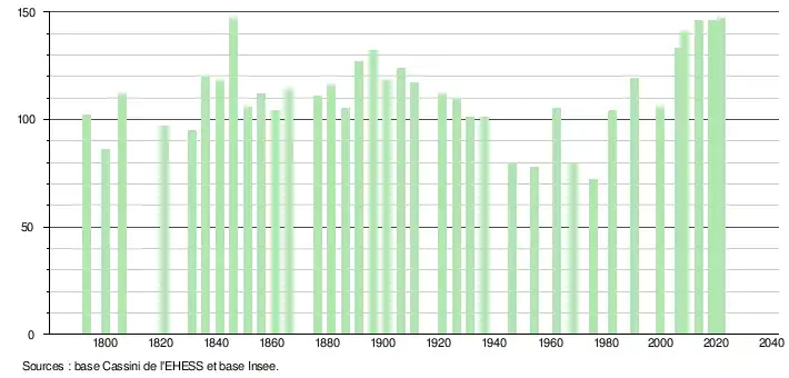 | L'évolution du nombre d'habitants est connue à travers les recensements de la population effectués dans la commune depuis 1793. Pour les communes de moins de 10 000 habitants, une enquête de recensement portant sur toute la population est réalisée tous les cinq ans, les populations légales des années intermédiaires étant quant à elles estimées par interpolation ou extrapolation[28]. Pour la commune, le premier recensement exhaustif entrant dans le cadre du nouveau dispositif a été réalisé en 2008[29]. En 2021, la commune comptait 147 habitants[Note 4], en diminution de 2 % par rapport à 2015 (Hautes-Pyrénées : +1,04 %, France hors Mayotte : +1,84 %). |