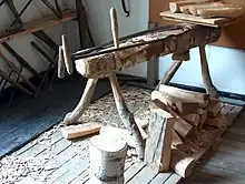 - 2. Le sabotier s'assied à l'établi (de Schniedbock) pour former la pièce. Il utilise un sabre ou couteau ( Holzschuemachersawel) fixé à l'établi[25].