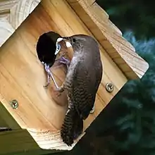 Troglodyte familier retirant un sac fécal de son nid