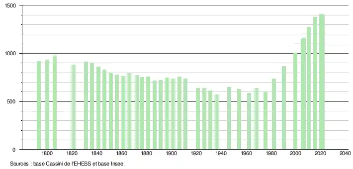 L'évolution du nombre d'habitants est connue à travers les recensements de la population effectués dans la commune depuis 1793. Pour les communes de moins de 10 000 habitants, une enquête de recensement portant sur toute la population est réalisée tous les cinq ans, les populations légales des années intermédiaires étant quant à elles estimées par interpolation ou extrapolation[38]. Pour la commune, le premier recensement exhaustif entrant dans le cadre du nouveau dispositif a été réalisé en 2005[39].