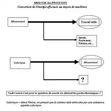 Cette partie préliminaire des Réflexions contient l’idée fondamentale que partout où il y a une différence de température, il existe la possibilité d’engendrer de la puissance motrice, idée qui joue un rôle central dans la thermodynamique. Et son corollaire n’est pas moins important : il est impossible de produire de la puissance motrice à moins qu’on ne dispose à la fois d’un corps froid et d’un corps chaud. Cela peut être considéré comme le premier énoncé de la deuxième loi de la thermodynamique également appelée principe de Carnot, même s’il revêt encore une forme imprécise[4].