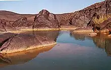 Guelta[40] est un terme d'origine berbère (Tageyilt) qui désigne des plans d'eau temporaires ou pérennes, sans écoulement apparent : des mares dans les lits des cours d'eau ou des "citernes naturelles" dans la roche en place. Ils peuvent être trouvés dans les situations protégées d'une trop grande exposition au soleil dans les massifs montagneux comme l'Ennedi et l'Adrar des Ifoghas au Mali.