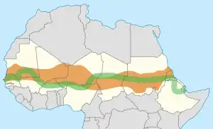 Le Sahel représenté en brun sur la carte. Il s'agit ici du Sahel méridional, c'est-à-dire les terres directement au sud du Sahara, et comprenant les îles du Cap-Vert, comprises entre les isohyètes de 200 à 600 mm de précipitations par an.