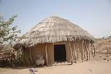 Maison soutenue par des piliers pour résister aux vents violents (nord du Cameroun).
