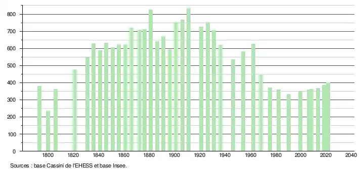 L'évolution du nombre d'habitants est connue à travers les recensements de la population effectués dans la commune depuis 1793. Pour les communes de moins de 10 000 habitants, une enquête de recensement portant sur toute la population est réalisée tous les cinq ans, les populations légales des années intermédiaires étant quant à elles estimées par interpolation ou extrapolation[42]. Pour la commune, le premier recensement exhaustif entrant dans le cadre du nouveau dispositif a été réalisé en 2008[43].
