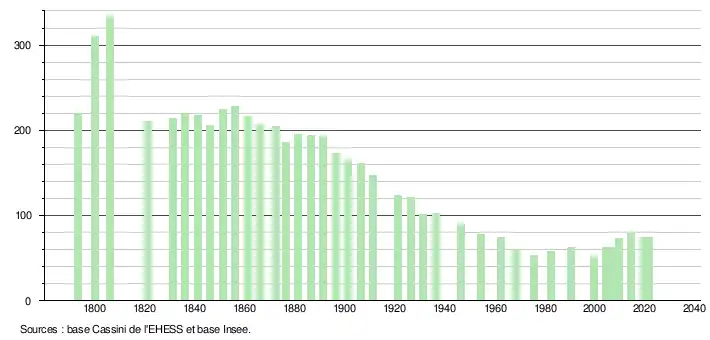 L'évolution du nombre d'habitants est connue à travers les recensements de la population effectués dans la commune depuis 1793. Pour les communes de moins de 10 000 habitants, une enquête de recensement portant sur toute la population est réalisée tous les cinq ans, les populations légales des années intermédiaires étant quant à elles estimées par interpolation ou extrapolation[27]. Pour la commune, le premier recensement exhaustif entrant dans le cadre du nouveau dispositif a été réalisé en 2004[28].