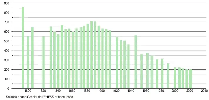 L'évolution du nombre d'habitants est connue à travers les recensements de la population effectués dans la commune depuis 1793. Pour les communes de moins de 10 000 habitants, une enquête de recensement portant sur toute la population est réalisée tous les cinq ans, les populations légales des années intermédiaires étant quant à elles estimées par interpolation ou extrapolation[17]. Pour la commune, le premier recensement exhaustif entrant dans le cadre du nouveau dispositif a été réalisé en 2005[18].