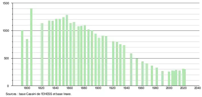 L'évolution du nombre d'habitants est connue à travers les recensements de la population effectués dans la commune depuis 1793. Pour les communes de moins de 10 000 habitants, une enquête de recensement portant sur toute la population est réalisée tous les cinq ans, les populations légales des années intermédiaires étant quant à elles estimées par interpolation ou extrapolation[18]. Pour la commune, le premier recensement exhaustif entrant dans le cadre du nouveau dispositif a été réalisé en 2004[19].