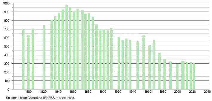 L'évolution du nombre d'habitants est connue à travers les recensements de la population effectués dans la commune depuis 1793. Pour les communes de moins de 10 000 habitants, une enquête de recensement portant sur toute la population est réalisée tous les cinq ans, les populations légales des années intermédiaires étant quant à elles estimées par interpolation ou extrapolation[21]. Pour la commune, le premier recensement exhaustif entrant dans le cadre du nouveau dispositif a été réalisé en 2007[22].