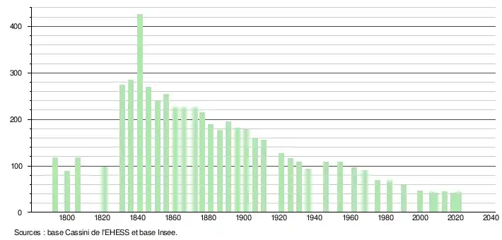 L'évolution du nombre d'habitants est connue à travers les recensements de la population effectués dans la commune depuis 1793. Pour les communes de moins de 10 000 habitants, une enquête de recensement portant sur toute la population est réalisée tous les cinq ans, les populations légales des années intermédiaires étant quant à elles estimées par interpolation ou extrapolation[30]. Pour la commune, le premier recensement exhaustif entrant dans le cadre du nouveau dispositif a été réalisé en 2008[31].