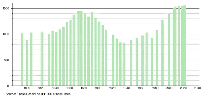 L'évolution du nombre d'habitants est connue à travers les recensements de la population effectués dans la commune depuis 1793. Pour les communes de moins de 10 000 habitants, une enquête de recensement portant sur toute la population est réalisée tous les cinq ans, les populations légales des années intermédiaires étant quant à elles estimées par interpolation ou extrapolation[19]. Pour la commune, le premier recensement exhaustif entrant dans le cadre du nouveau dispositif a été réalisé en 2008[20].