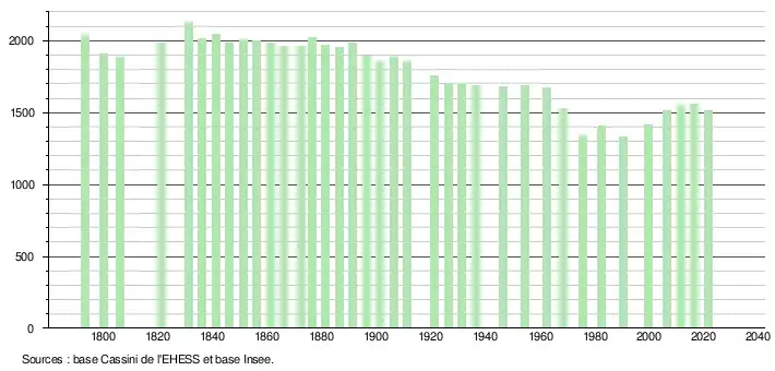 L'évolution du nombre d'habitants est connue à travers les recensements de la population effectués dans la commune depuis 1793. Pour les communes de moins de 10 000 habitants, une enquête de recensement portant sur toute la population est réalisée tous les cinq ans, les populations légales des années intermédiaires étant quant à elles estimées par interpolation ou extrapolation[20]. Pour la commune, le premier recensement exhaustif entrant dans le cadre du nouveau dispositif a été réalisé en 2006[21].