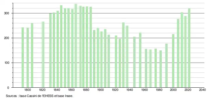 L'évolution du nombre d'habitants est connue à travers les recensements de la population effectués dans la commune depuis 1793. Pour les communes de moins de 10 000 habitants, une enquête de recensement portant sur toute la population est réalisée tous les cinq ans, les populations légales des années intermédiaires étant quant à elles estimées par interpolation ou extrapolation[24]. Pour la commune, le premier recensement exhaustif entrant dans le cadre du nouveau dispositif a été réalisé en 2006[25].