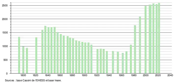 L'évolution du nombre d'habitants est connue à travers les recensements de la population effectués dans la commune depuis 1793. Pour les communes de moins de 10 000 habitants, une enquête de recensement portant sur toute la population est réalisée tous les cinq ans, les populations légales des années intermédiaires étant quant à elles estimées par interpolation ou extrapolation[21]. Pour la commune, le premier recensement exhaustif entrant dans le cadre du nouveau dispositif a été réalisé en 2007[22].