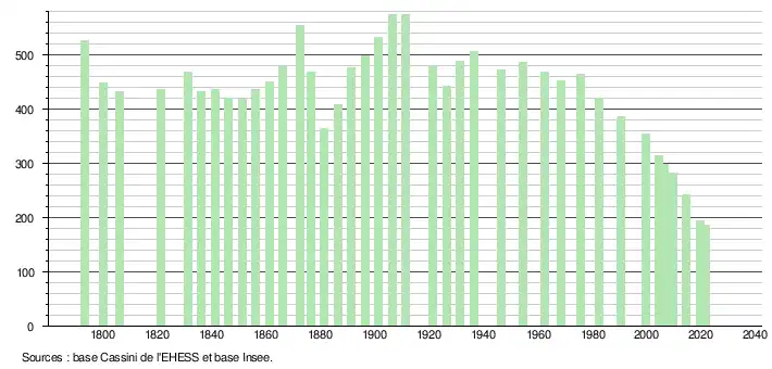 L'évolution du nombre d'habitants est connue à travers les recensements de la population effectués dans la commune depuis 1793. Pour les communes de moins de 10 000 habitants, une enquête de recensement portant sur toute la population est réalisée tous les cinq ans, les populations légales des années intermédiaires étant quant à elles estimées par interpolation ou extrapolation[21]. Pour la commune, le premier recensement exhaustif entrant dans le cadre du nouveau dispositif a été réalisé en 2004[22].