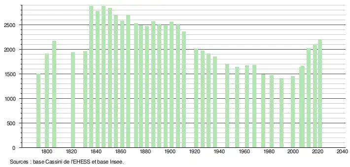 L'évolution du nombre d'habitants est connue à travers les recensements de la population effectués dans la commune depuis 1793. Pour les communes de moins de 10 000 habitants, une enquête de recensement portant sur toute la population est réalisée tous les cinq ans, les populations légales des années intermédiaires étant quant à elles estimées par interpolation ou extrapolation[19]. Pour la commune, le premier recensement exhaustif entrant dans le cadre du nouveau dispositif a été réalisé en 2007[20].