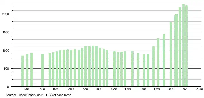 L'évolution du nombre d'habitants est connue à travers les recensements de la population effectués dans la commune depuis 1793. Pour les communes de moins de 10 000 habitants, une enquête de recensement portant sur toute la population est réalisée tous les cinq ans, les populations légales des années intermédiaires étant quant à elles estimées par interpolation ou extrapolation[30]. Pour la commune, le premier recensement exhaustif entrant dans le cadre du nouveau dispositif a été réalisé en 2007[31].
