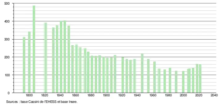 L'évolution du nombre d'habitants est connue à travers les recensements de la population effectués dans la commune depuis 1793. Pour les communes de moins de 10 000 habitants, une enquête de recensement portant sur toute la population est réalisée tous les cinq ans, les populations légales des années intermédiaires étant quant à elles estimées par interpolation ou extrapolation[19]. Pour la commune, le premier recensement exhaustif entrant dans le cadre du nouveau dispositif a été réalisé en 2007[20].