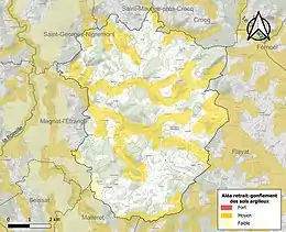 Le retrait-gonflement des sols argileux est susceptible d'engendrer des dommages importants aux bâtiments en cas d’alternance de périodes de sécheresse et de pluie. 33,8 % de la superficie communale est en aléa moyen ou fort (33,6 % au niveau départemental et 48,5 % au niveau national). Sur les 183 bâtiments dénombrés sur la commune en 2019, 42 sont en aléa moyen ou fort, soit 23 %, à comparer aux 25 % au niveau départemental et 54 % au niveau national. Une cartographie de l'exposition du territoire national au retrait gonflement des sols argileux est disponible sur le site du BRGM[16],[Carte 2].