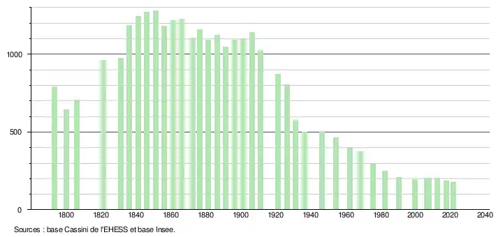 L'évolution du nombre d'habitants est connue à travers les recensements de la population effectués dans la commune depuis 1793. Pour les communes de moins de 10 000 habitants, une enquête de recensement portant sur toute la population est réalisée tous les cinq ans, les populations légales des années intermédiaires étant quant à elles estimées par interpolation ou extrapolation[19]. Pour la commune, le premier recensement exhaustif entrant dans le cadre du nouveau dispositif a été réalisé en 2007[20].