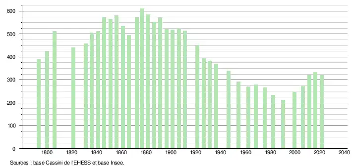 L'évolution du nombre d'habitants est connue à travers les recensements de la population effectués dans la commune depuis 1793. Pour les communes de moins de 10 000 habitants, une enquête de recensement portant sur toute la population est réalisée tous les cinq ans, les populations légales des années intermédiaires étant quant à elles estimées par interpolation ou extrapolation[26]. Pour la commune, le premier recensement exhaustif entrant dans le cadre du nouveau dispositif a été réalisé en 2006[27].
