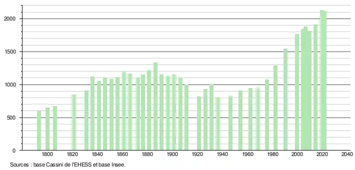 L'évolution du nombre d'habitants est connue à travers les recensements de la population effectués dans la commune depuis 1793. Pour les communes de moins de 10 000 habitants, une enquête de recensement portant sur toute la population est réalisée tous les cinq ans, les populations légales des années intermédiaires étant quant à elles estimées par interpolation ou extrapolation[27]. Pour la commune, le premier recensement exhaustif entrant dans le cadre du nouveau dispositif a été réalisé en 2004[28].