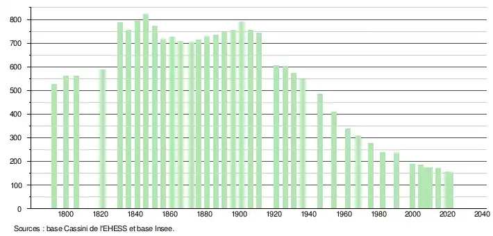 L'évolution du nombre d'habitants est connue à travers les recensements de la population effectués dans la commune depuis 1793. Pour les communes de moins de 10 000 habitants, une enquête de recensement portant sur toute la population est réalisée tous les cinq ans, les populations légales des années intermédiaires étant quant à elles estimées par interpolation ou extrapolation[20]. Pour la commune, le premier recensement exhaustif entrant dans le cadre du nouveau dispositif a été réalisé en 2004[21].