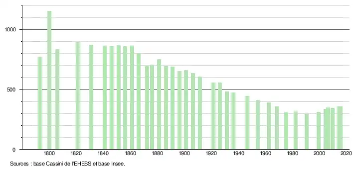 L'évolution du nombre d'habitants est connue à travers les recensements de la population effectués dans la commune depuis 1793. Pour les communes de moins de 10 000 habitants, une enquête de recensement portant sur toute la population est réalisée tous les cinq ans, les populations légales des années intermédiaires étant quant à elles estimées par interpolation ou extrapolation[13]. Pour la commune, le premier recensement exhaustif entrant dans le cadre du nouveau dispositif a été réalisé en 2004[14].