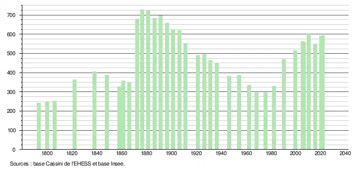 L'évolution du nombre d'habitants est connue à travers les recensements de la population effectués dans la commune depuis 1793. Pour les communes de moins de 10 000 habitants, une enquête de recensement portant sur toute la population est réalisée tous les cinq ans, les populations légales des années intermédiaires étant quant à elles estimées par interpolation ou extrapolation[18]. Pour la commune, le premier recensement exhaustif entrant dans le cadre du nouveau dispositif a été réalisé en 2005[19].