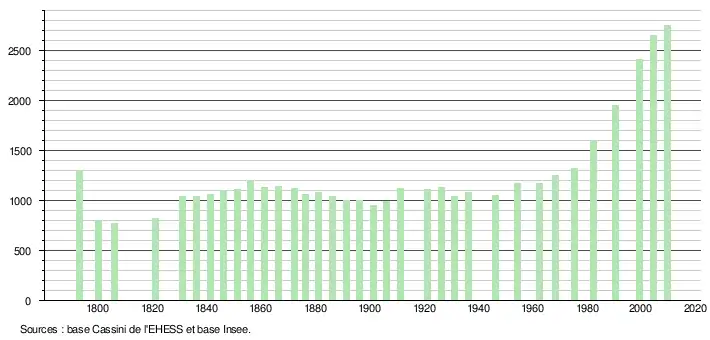L'évolution du nombre d'habitants est connue à travers les recensements de la population effectués dans la commune depuis 1793. À partir du , les populations légales des communes sont publiées annuellement dans le cadre d'un recensement qui repose désormais sur une collecte d'information annuelle, concernant successivement tous les territoires communaux au cours d'une période de cinq ans. Pour les communes de moins de 10 000 habitants, une enquête de recensement portant sur toute la population est réalisée tous les cinq ans, les populations légales des années intermédiaires étant quant à elles estimées par interpolation ou extrapolation[17]. Pour la commune, le premier recensement exhaustif entrant dans le cadre du nouveau dispositif a été réalisé en 2004[18],[Note 1].