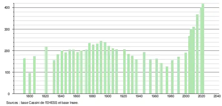 L'évolution du nombre d'habitants est connue à travers les recensements de la population effectués dans la commune depuis 1793. Pour les communes de moins de 10 000 habitants, une enquête de recensement portant sur toute la population est réalisée tous les cinq ans, les populations légales des années intermédiaires étant quant à elles estimées par interpolation ou extrapolation[17]. Pour la commune, le premier recensement exhaustif entrant dans le cadre du nouveau dispositif a été réalisé en 2004[18].