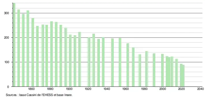 L'évolution du nombre d'habitants est connue à travers les recensements de la population effectués dans la commune depuis 1841. Pour les communes de moins de 10 000 habitants, une enquête de recensement portant sur toute la population est réalisée tous les cinq ans, les populations légales des années intermédiaires étant quant à elles estimées par interpolation ou extrapolation[13]. Pour la commune, le premier recensement exhaustif entrant dans le cadre du nouveau dispositif a été réalisé en 2004[14].