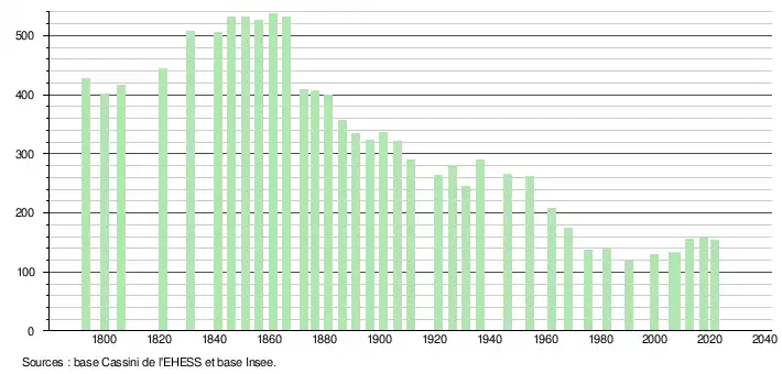 L'évolution du nombre d'habitants est connue à travers les recensements de la population effectués dans la commune depuis 1793. Pour les communes de moins de 10 000 habitants, une enquête de recensement portant sur toute la population est réalisée tous les cinq ans, les populations légales des années intermédiaires étant quant à elles estimées par interpolation ou extrapolation[23]. Pour la commune, le premier recensement exhaustif entrant dans le cadre du nouveau dispositif a été réalisé en 2007[24].