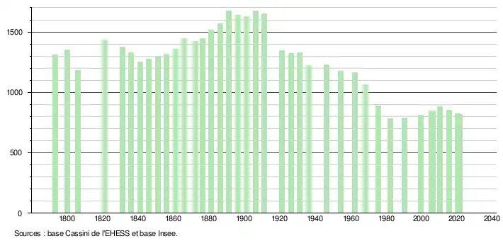 L'évolution du nombre d'habitants est connue à travers les recensements de la population effectués dans la commune depuis 1793. Pour les communes de moins de 10 000 habitants, une enquête de recensement portant sur toute la population est réalisée tous les cinq ans, les populations légales des années intermédiaires étant quant à elles estimées par interpolation ou extrapolation[35]. Pour la commune, le premier recensement exhaustif entrant dans le cadre du nouveau dispositif a été réalisé en 2005[36].
