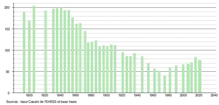 L'évolution du nombre d'habitants est connue à travers les recensements de la population effectués dans la commune depuis 1793. Pour les communes de moins de 10 000 habitants, une enquête de recensement portant sur toute la population est réalisée tous les cinq ans, les populations légales des années intermédiaires étant quant à elles estimées par interpolation ou extrapolation[18]. Pour la commune, le premier recensement exhaustif entrant dans le cadre du nouveau dispositif a été réalisé en 2005[19].
