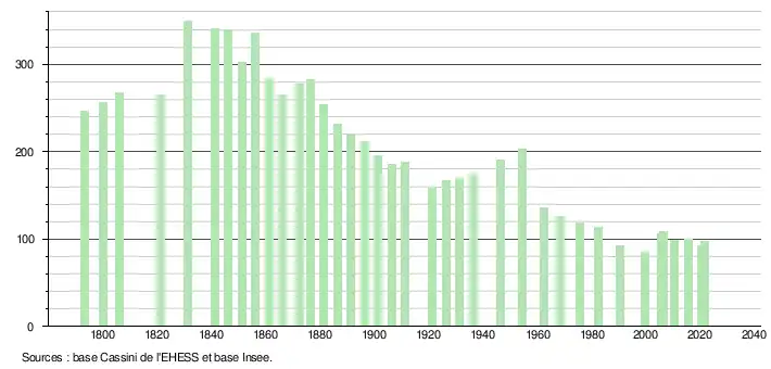 | L'évolution du nombre d'habitants est connue à travers les recensements de la population effectués dans la commune depuis 1793. Pour les communes de moins de 10 000 habitants, une enquête de recensement portant sur toute la population est réalisée tous les cinq ans, les populations légales des années intermédiaires étant quant à elles estimées par interpolation ou extrapolation[23]. Pour la commune, le premier recensement exhaustif entrant dans le cadre du nouveau dispositif a été réalisé en 2005[24]. En 2021, la commune comptait 97 habitants[Note 3], en diminution de 3 % par rapport à 2015 (Gers : +0,79 %, France hors Mayotte : +1,84 %). |