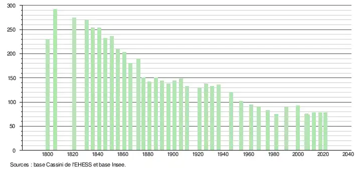 L'évolution du nombre d'habitants est connue à travers les recensements de la population effectués dans la commune depuis 1800. Pour les communes de moins de 10 000 habitants, une enquête de recensement portant sur toute la population est réalisée tous les cinq ans, les populations légales des années intermédiaires étant quant à elles estimées par interpolation ou extrapolation[32]. Pour la commune, le premier recensement exhaustif entrant dans le cadre du nouveau dispositif a été réalisé en 2007[33].