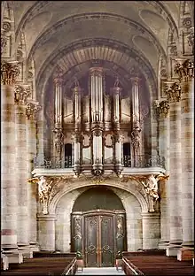 L'abbatiale vue depuis la place de la Victoire, place centrale de la ville. | |