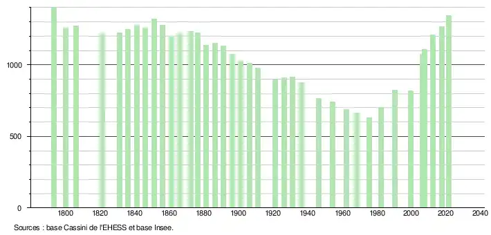L'évolution du nombre d'habitants est connue à travers les recensements de la population effectués dans la commune depuis 1793. Pour les communes de moins de 10 000 habitants, une enquête de recensement portant sur toute la population est réalisée tous les cinq ans, les populations légales des années intermédiaires étant quant à elles estimées par interpolation ou extrapolation[22]. Pour la commune, le premier recensement exhaustif entrant dans le cadre du nouveau dispositif a été réalisé en 2007[23].