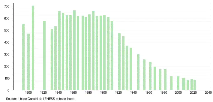 L'évolution du nombre d'habitants est connue à travers les recensements de la population effectués dans la commune depuis 1793. Pour les communes de moins de 10 000 habitants, une enquête de recensement portant sur toute la population est réalisée tous les cinq ans, les populations légales des années intermédiaires étant quant à elles estimées par interpolation ou extrapolation[19]. Pour la commune, le premier recensement exhaustif entrant dans le cadre du nouveau dispositif a été réalisé en 2007[20].