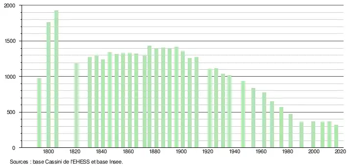 L'évolution du nombre d'habitants est connue à travers les recensements de la population effectués dans la commune depuis 1793. Pour les communes de moins de 10 000 habitants, une enquête de recensement portant sur toute la population est réalisée tous les cinq ans, les populations légales des années intermédiaires étant quant à elles estimées par interpolation ou extrapolation[5]. Pour la commune, le premier recensement exhaustif entrant dans le cadre du nouveau dispositif a été réalisé en 2006[6].