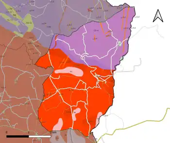 L'occupation des sols de la commune, telle qu'elle ressort de la base de données européenne d’occupation biophysique des sols Corine Land Cover (CLC), est marquée par l'importance des forêts et milieux semi-naturels (56,1 % en 2018), une proportion identique à celle de 1990 (55,7 %). La répartition détaillée en 2018 est la suivante : forêts (56,1 %), zones agricoles hétérogènes (36,4 %), prairies (7,5 %)[33]. L'évolution de l’occupation des sols de la commune et de ses infrastructures peut être observée sur les différentes représentations cartographiques du territoire : la carte de Cassini (XVIIIe siècle), la carte d'état-major (1820-1866) et les cartes ou photos aériennes de l'IGN pour la période actuelle (1950 à aujourd'hui)[Carte 3].