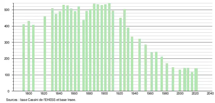 L'évolution du nombre d'habitants est connue à travers les recensements de la population effectués dans la commune depuis 1793. Pour les communes de moins de 10 000 habitants, une enquête de recensement portant sur toute la population est réalisée tous les cinq ans, les populations légales des années intermédiaires étant quant à elles estimées par interpolation ou extrapolation[20]. Pour la commune, le premier recensement exhaustif entrant dans le cadre du nouveau dispositif a été réalisé en 2005[21].