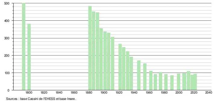 L'évolution du nombre d'habitants est connue à travers les recensements de la population effectués dans la commune depuis 1793. Pour les communes de moins de 10 000 habitants, une enquête de recensement portant sur toute la population est réalisée tous les cinq ans, les populations légales des années intermédiaires étant quant à elles estimées par interpolation ou extrapolation[45]. Pour la commune, le premier recensement exhaustif entrant dans le cadre du nouveau dispositif a été réalisé en 2007[46].
