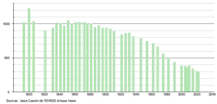 L'évolution du nombre d'habitants est connue à travers les recensements de la population effectués dans la commune depuis 1793. Pour les communes de moins de 10 000 habitants, une enquête de recensement portant sur toute la population est réalisée tous les cinq ans, les populations légales des années intermédiaires étant quant à elles estimées par interpolation ou extrapolation[19]. Pour la commune, le premier recensement exhaustif entrant dans le cadre du nouveau dispositif a été réalisé en 2004[20].