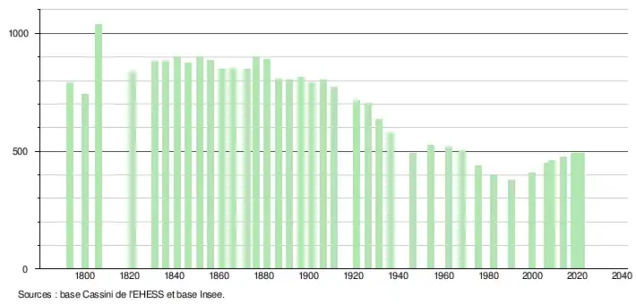 L'évolution du nombre d'habitants est connue à travers les recensements de la population effectués dans la commune depuis 1793. Pour les communes de moins de 10 000 habitants, une enquête de recensement portant sur toute la population est réalisée tous les cinq ans, les populations légales des années intermédiaires étant quant à elles estimées par interpolation ou extrapolation[16]. Pour la commune, le premier recensement exhaustif entrant dans le cadre du nouveau dispositif a été réalisé en 2008[17].